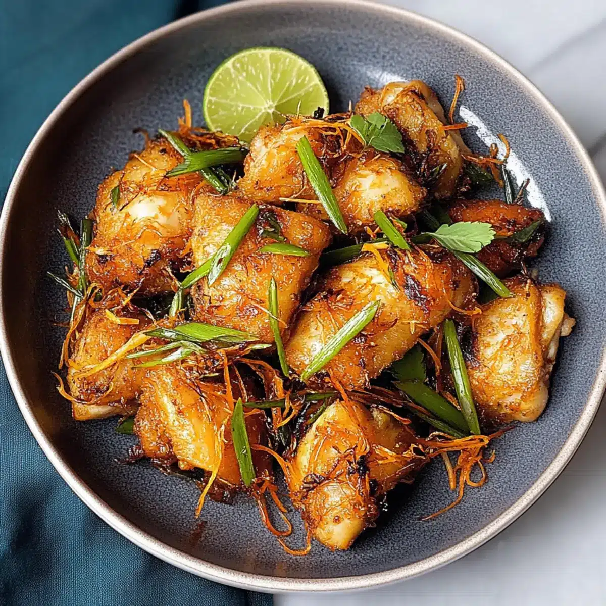 Once the chicken is perfectly crispy, use a slotted spoon to transfer it onto paper towels, allowing excess oil to drain. Toss the hot chicken pieces with fresh makrut lime leaves for an added burst of citrus aroma. Serve your Aromatic Thai Lemongrass Chicken hot and enjoy the vibrant flavors straight from your home kitchen!