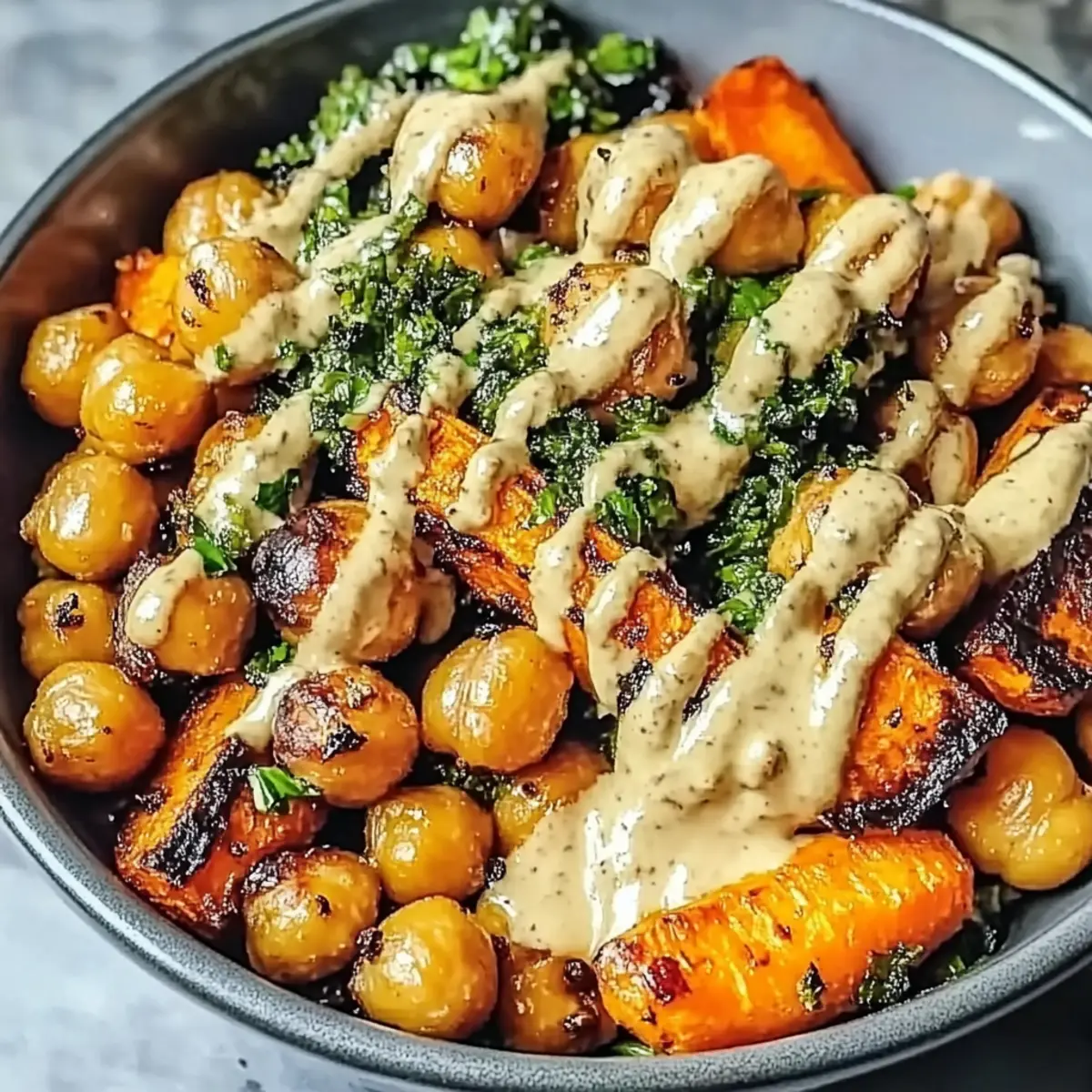 Once your vegetables have roasted to perfection, remove them from the oven and let them cool slightly. In a serving bowl, combine the warm roasted carrots and chickpeas, then drizzle generously with the tahini dressing. The creamy sauce will perfectly complement the crispiness and sweetness of your dish.