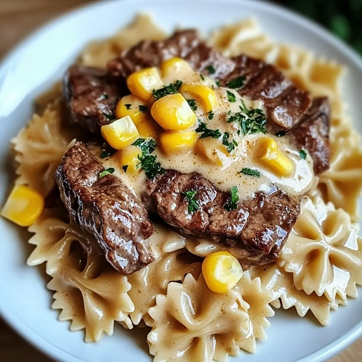 Creamy Parmesan Steak & Sweet Corn Bowtie Bliss on Your Table