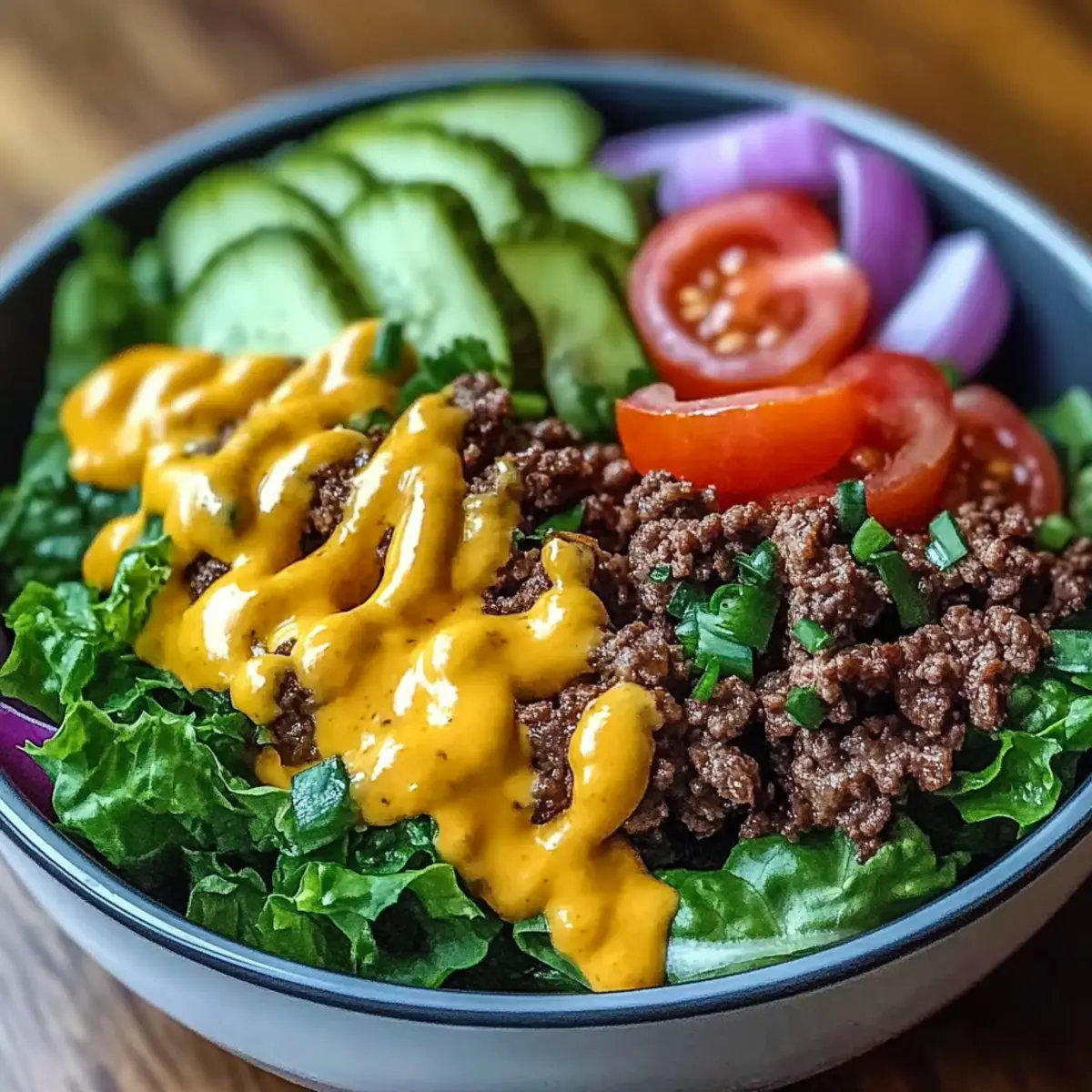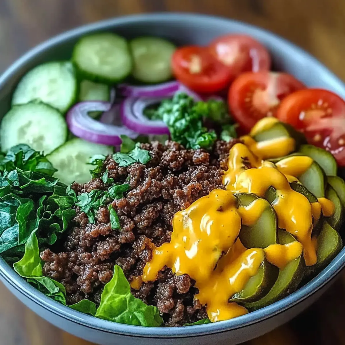 Now it’s time to bring your Cheeseburger Bowls to life! Start by placing a generous layer of chopped lettuce or cooked grains at the bottom of each bowl. Top with the browned meat, followed by the vibrant array of veggies and shredded cheese. Don’t forget to leave room for the sauce!