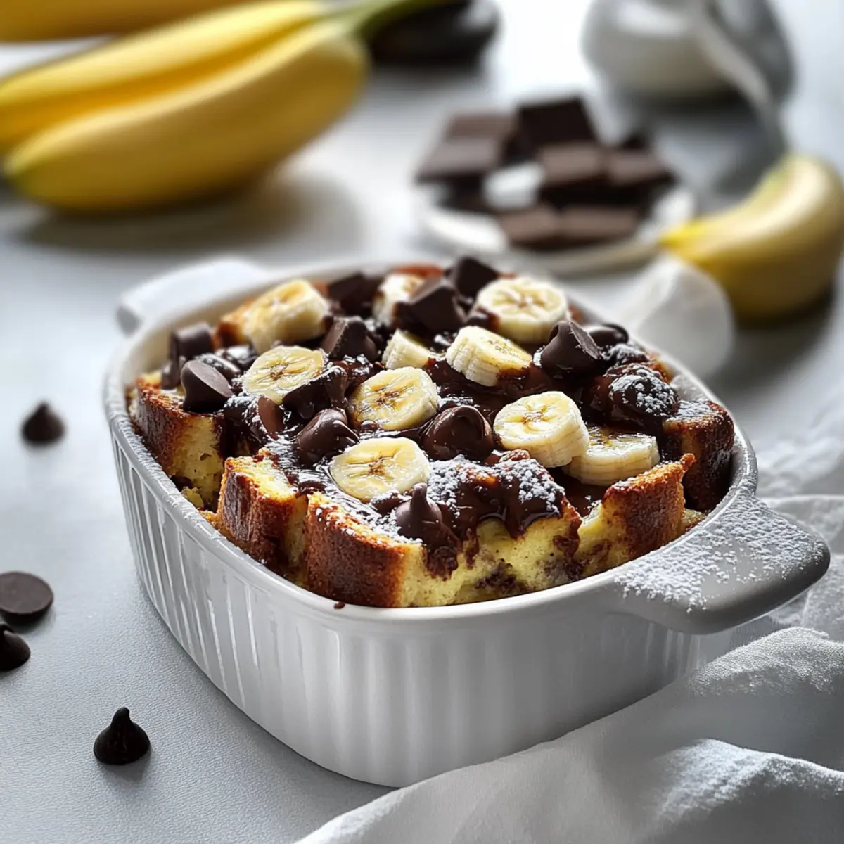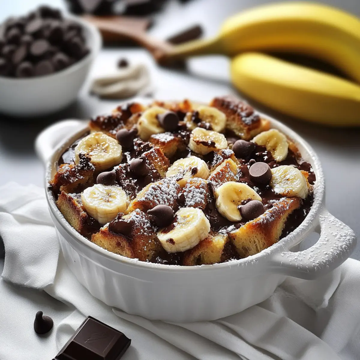 - Assemble the Pudding: Tear brioche into bite-sized pieces, add to custard mix with sliced bananas and chocolate chips, and fold gently.