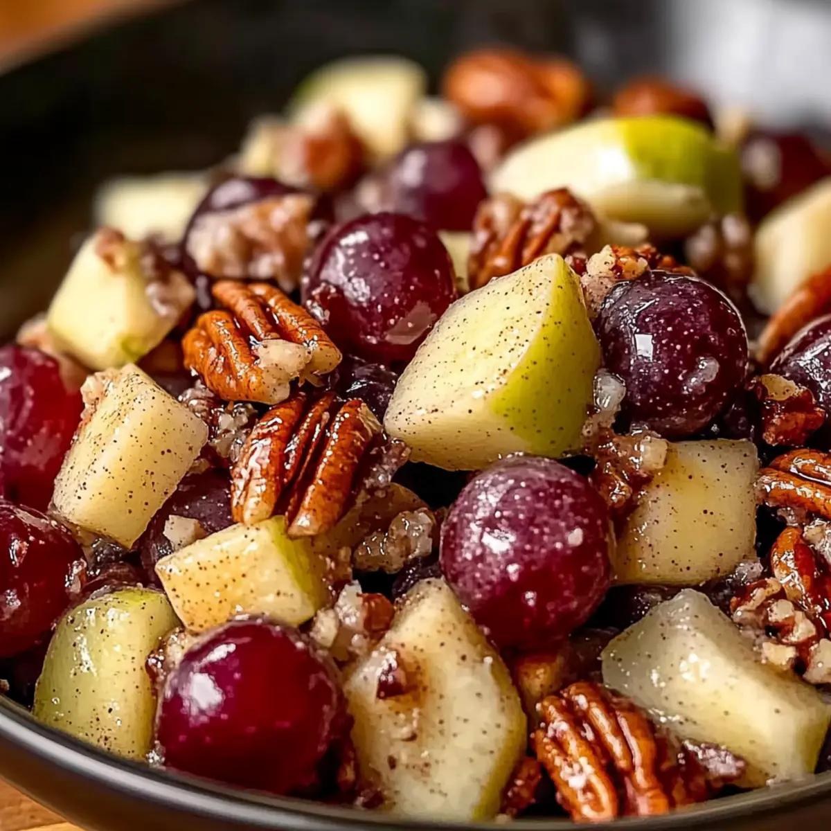 For the best experience, serve your Cinnamon Apple Grape Salad immediately. Garnish it with a sprinkle of cinnamon and a few whole pecans on top for added flair. If you need to prepare it ahead of time, refrigerate it for up to 2 hours while avoiding adding nuts until just before serving to maintain their crunchiness.