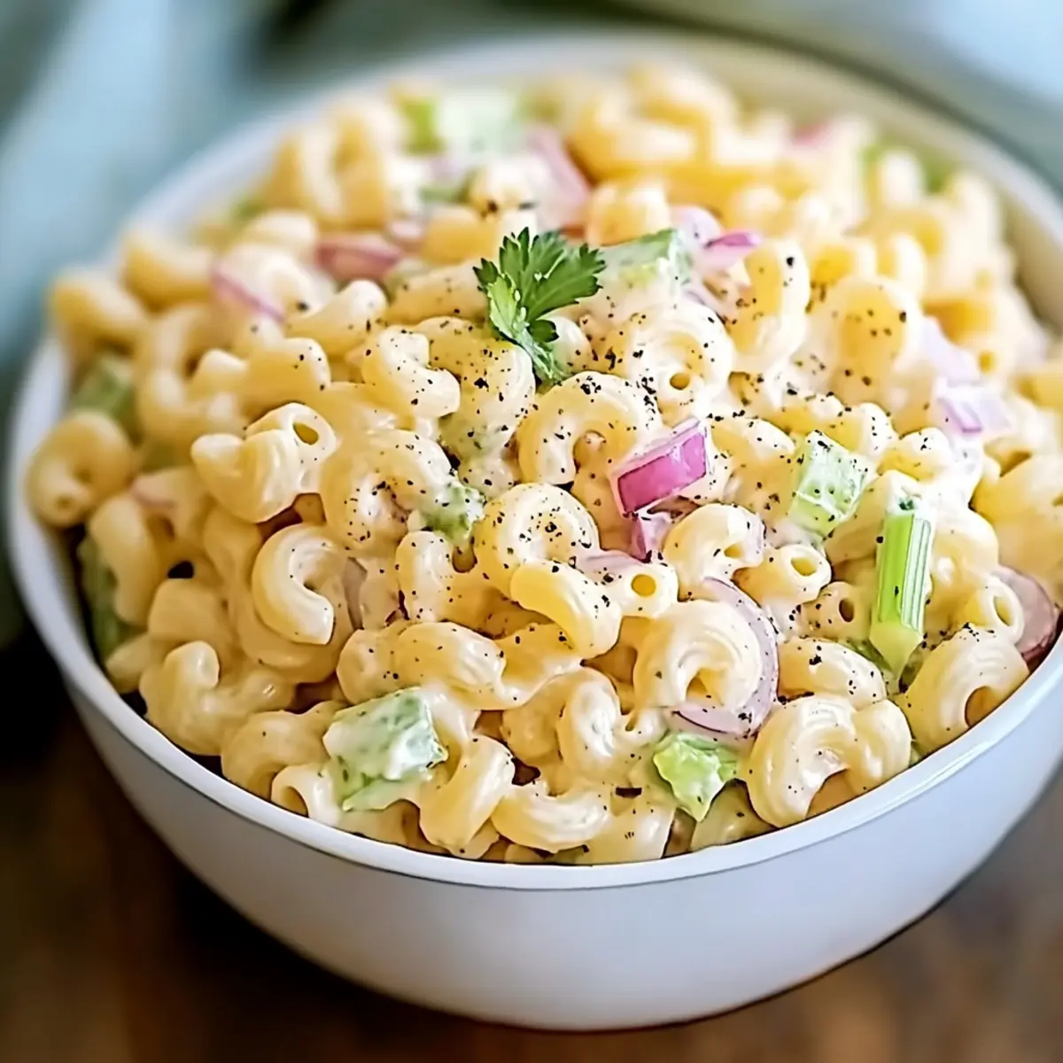 Nostalgic Flavors: Every bite of this Classic Macaroni Salad is like a trip down memory lane, filled with vibrant veggies and creamy goodness.