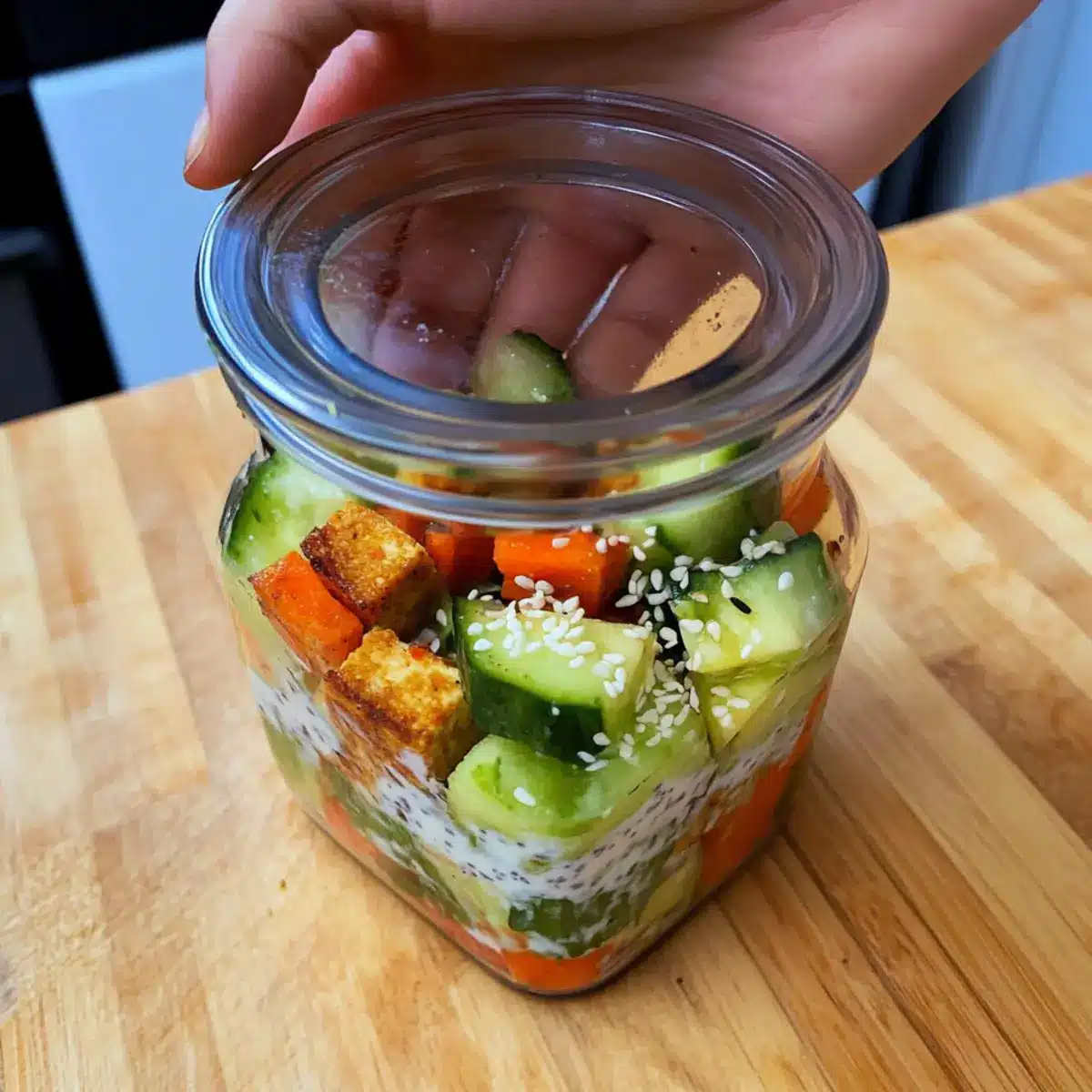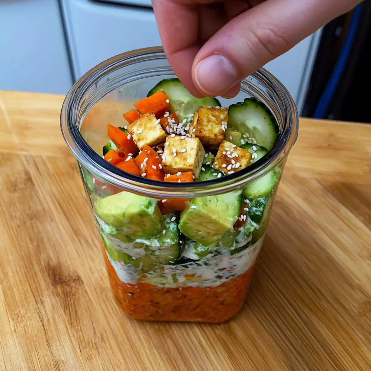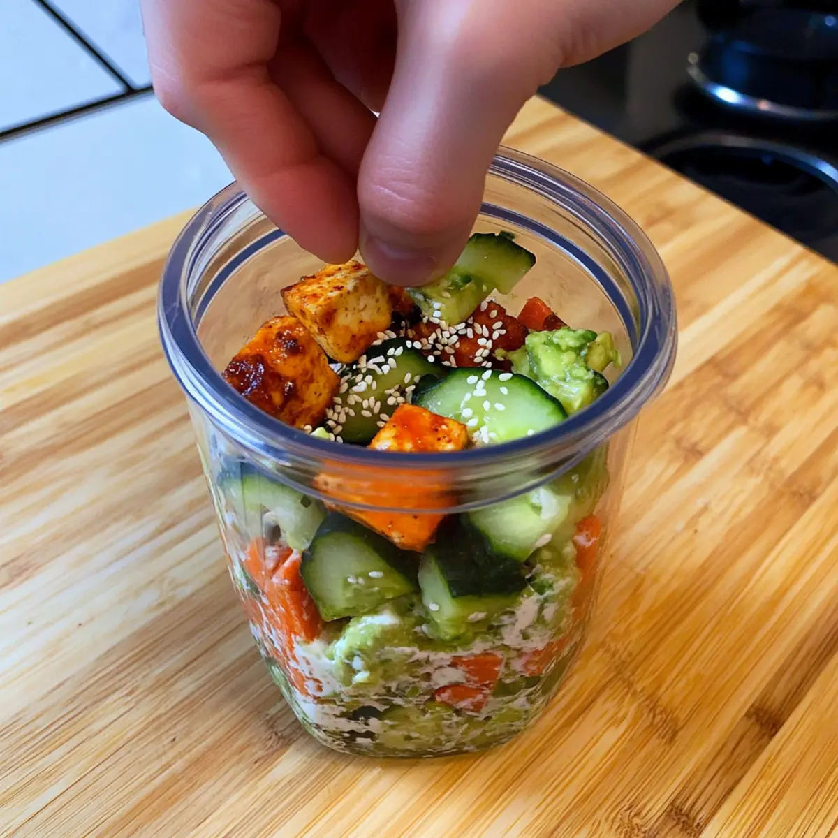 - Layer ingredients in a mason jar starting with sliced cucumbers at the bottom followed by carrots, edamame, tofu, avocado, and spring onions.