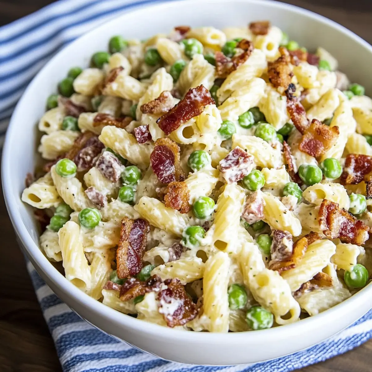 - In a large bowl, combine pasta, peas, bacon, and Parmesan. Pour dressing over and fold gently.