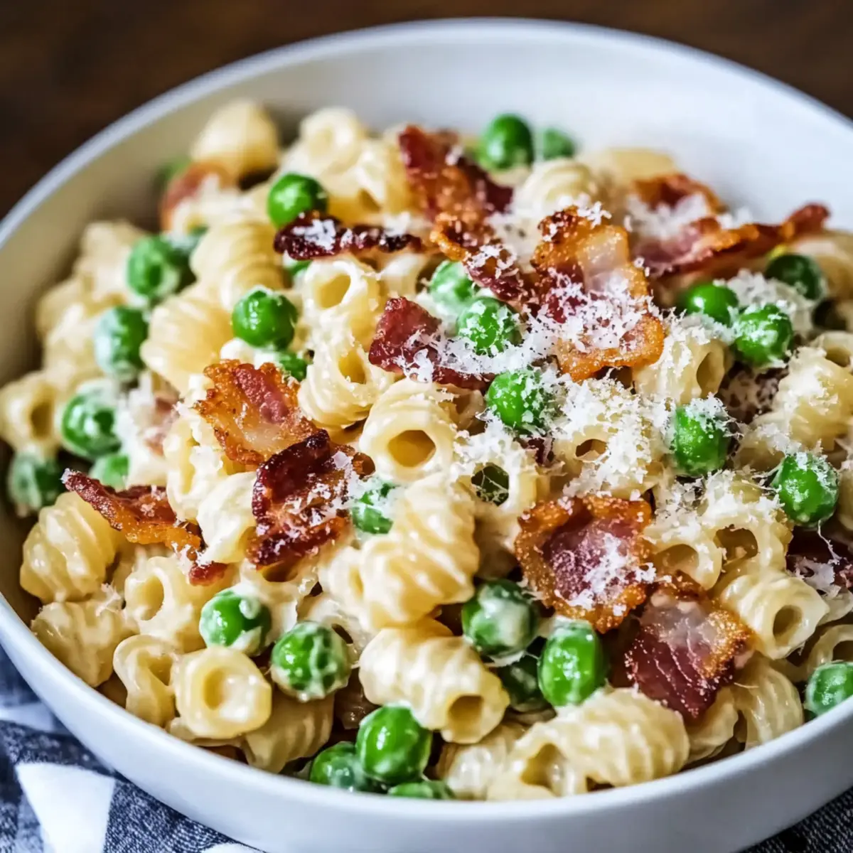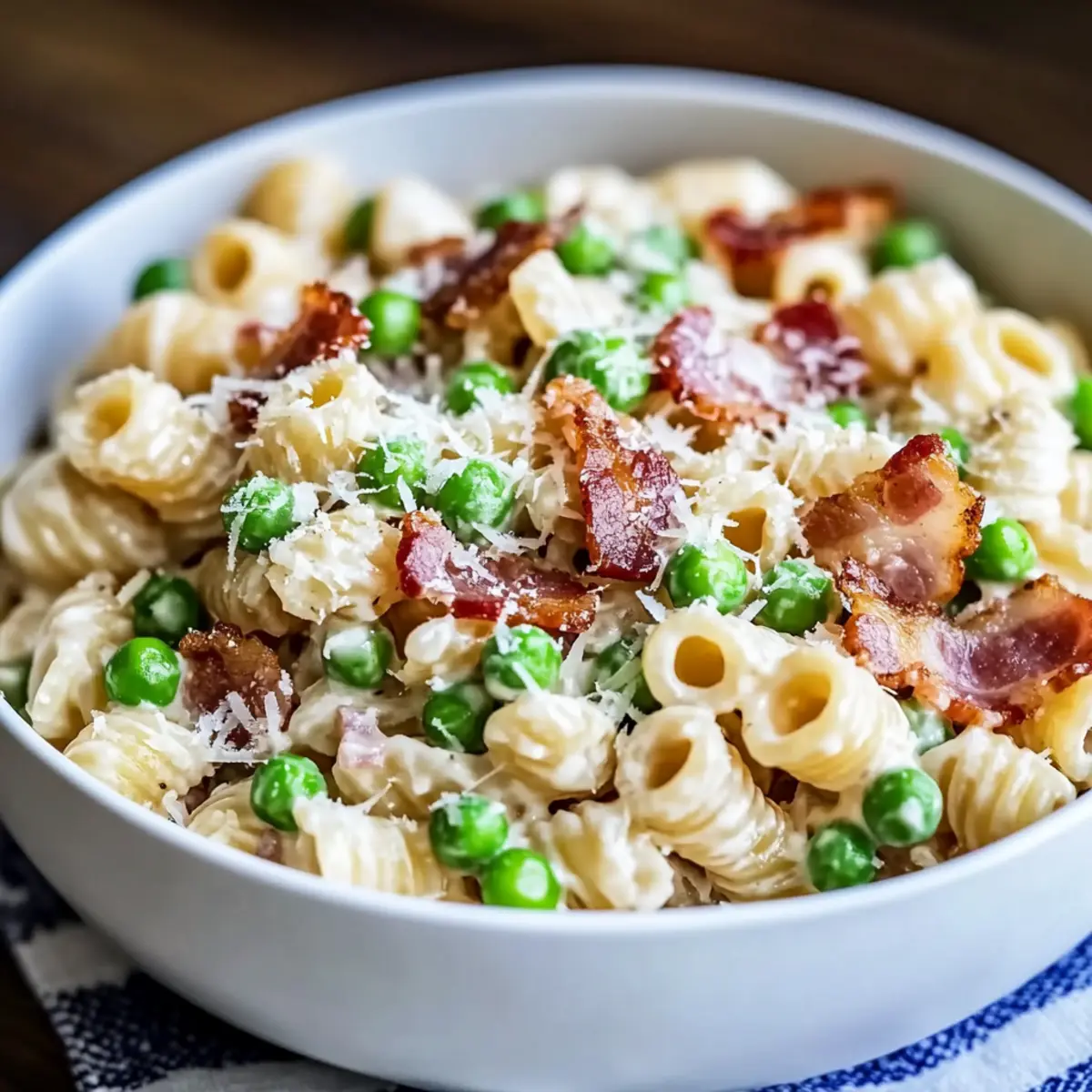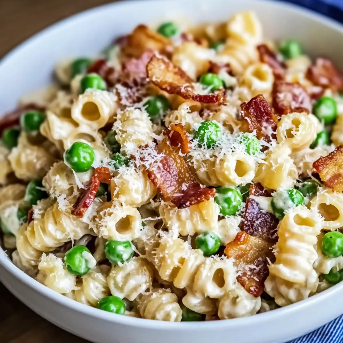 - In a large bowl, combine cooled pasta, bacon, and peas. Add Parmesan cheese and gently fold together.