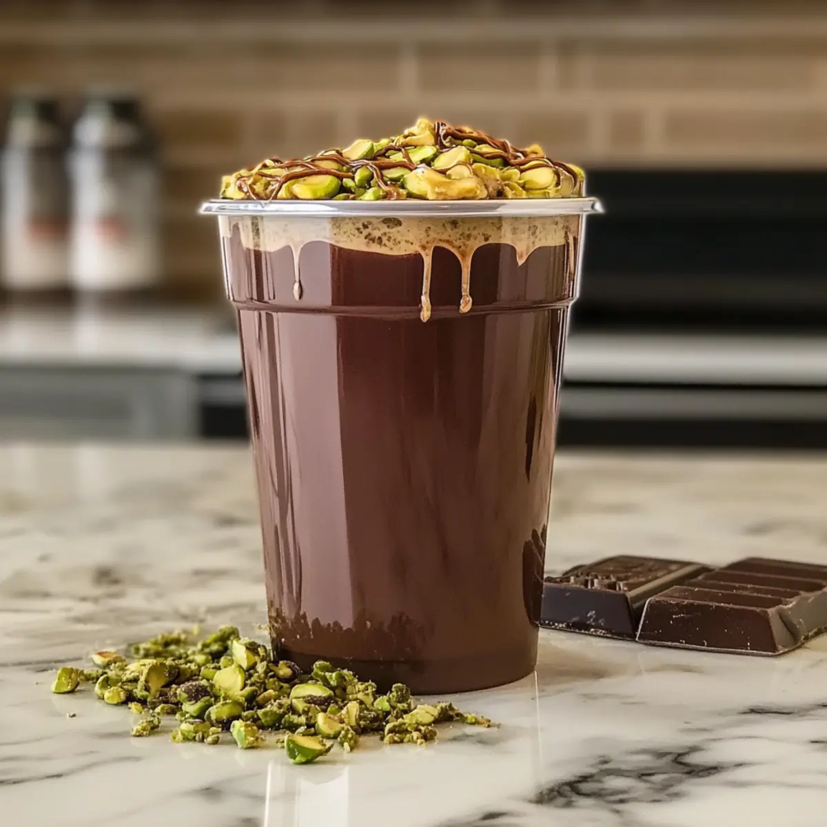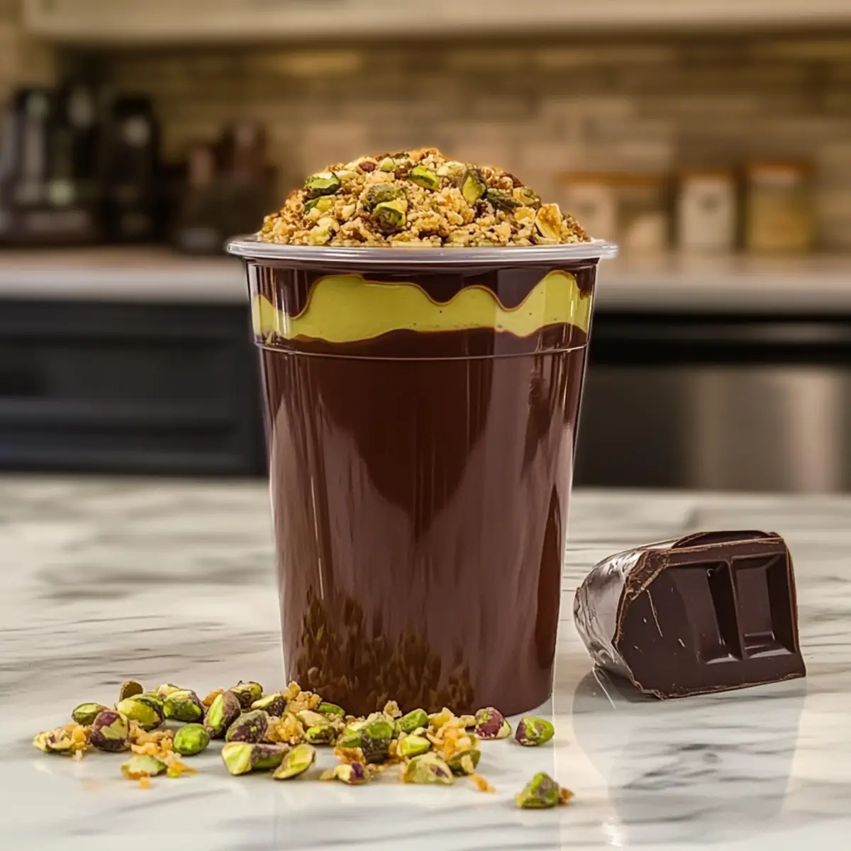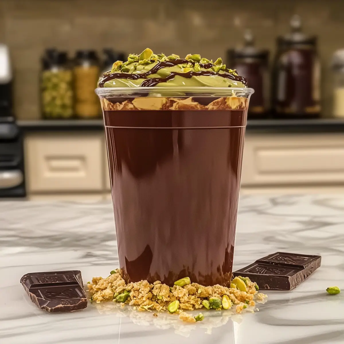 Retrieve your chocolate-lined cups from the freezer, and gently pour in the pistachio milkshake blend, filling them almost to the brim. Take the toasted kataifi that you reserved and sprinkle it generously on top of each shake for that irresistible crunch. For added texture, consider garnishing with some chopped raw pistachios as well.