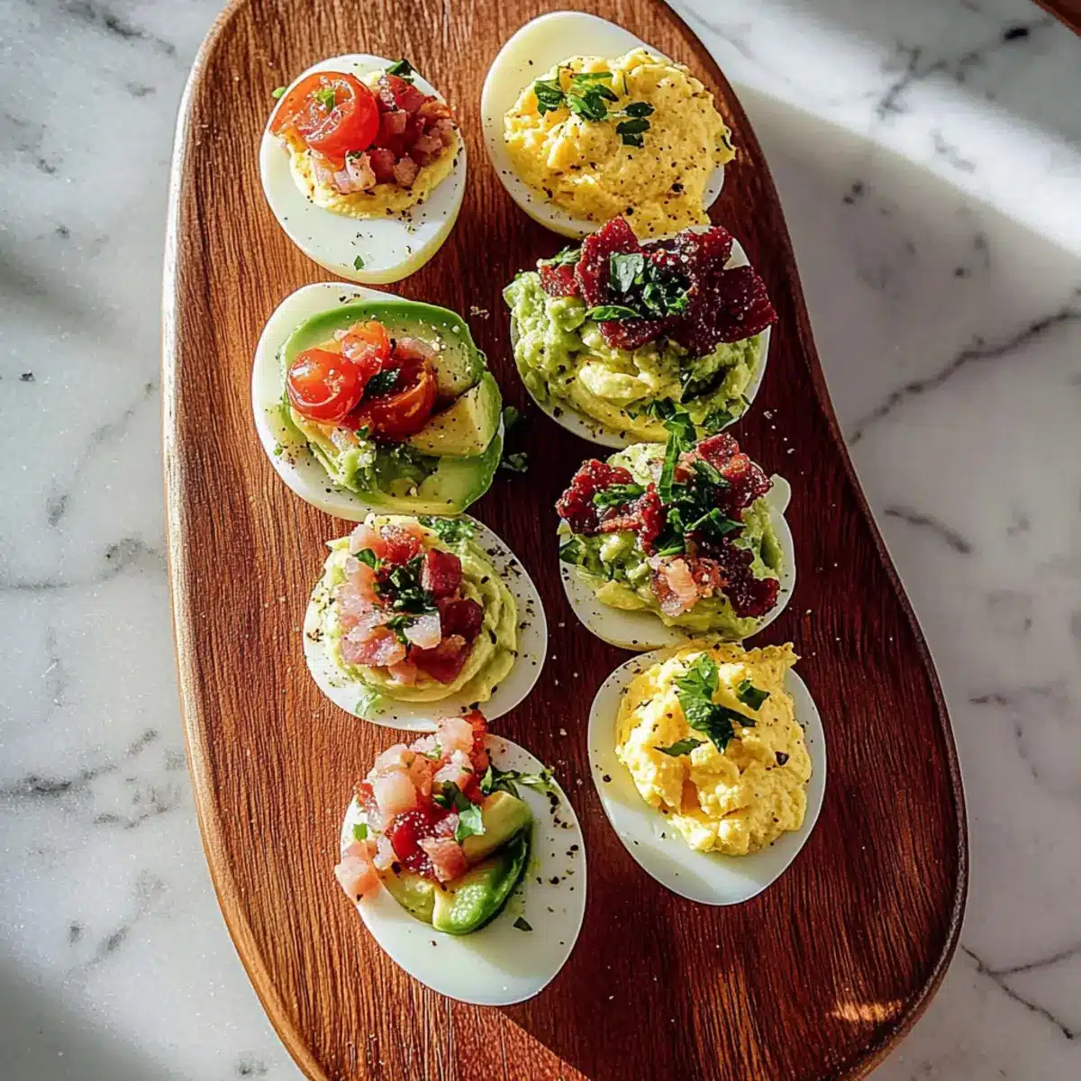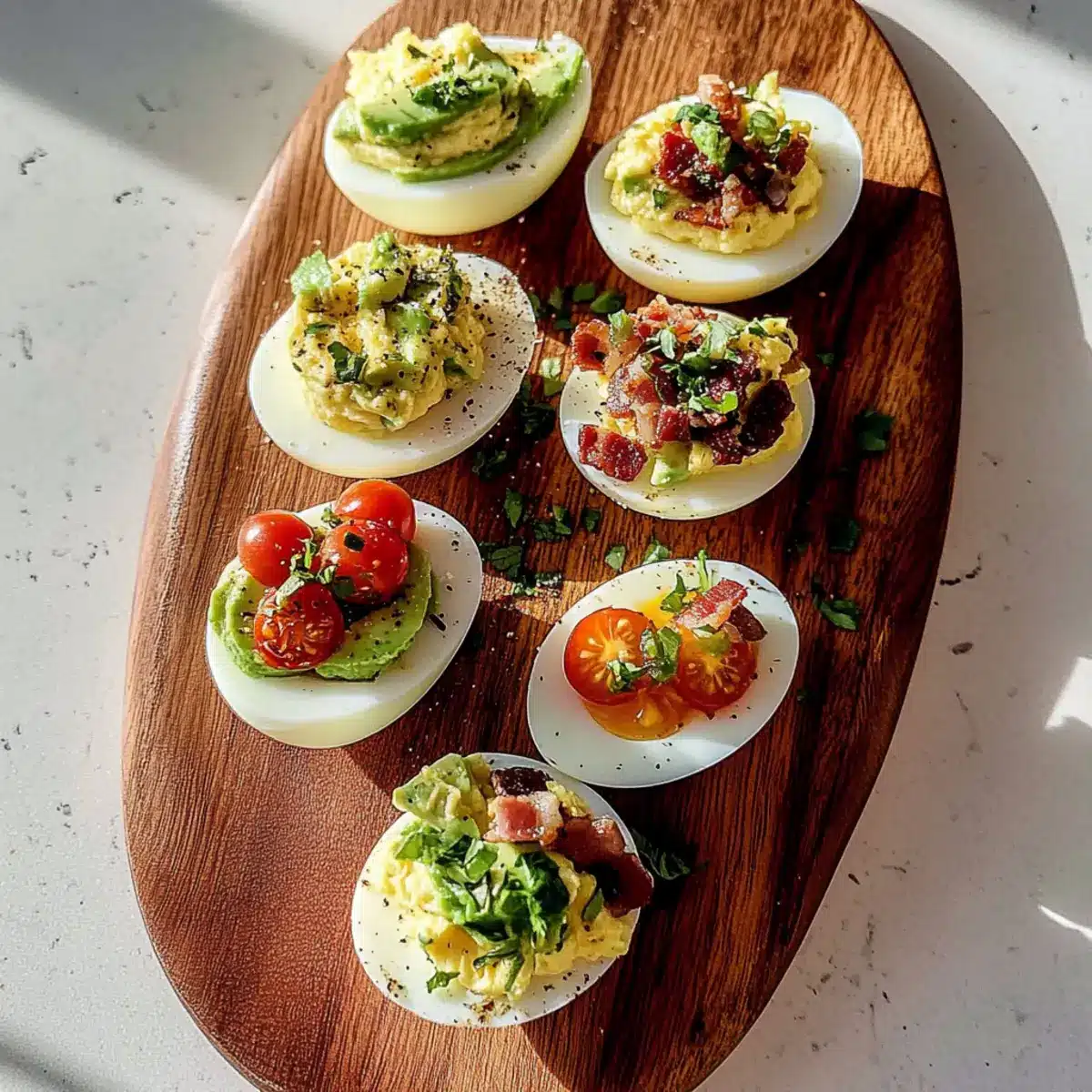 Now comes the fun! Gather various toppings like crispy bacon, fresh avocado slices, colorful cherry tomatoes, shredded cheese, and any other creative additions you desire. Top each filled egg with a unique combination of your chosen toppings—experiment with flavors like Buffalo & Dill or Taco Avocado to create a vibrant Egg Flight that excites the palate and impresses your guests.