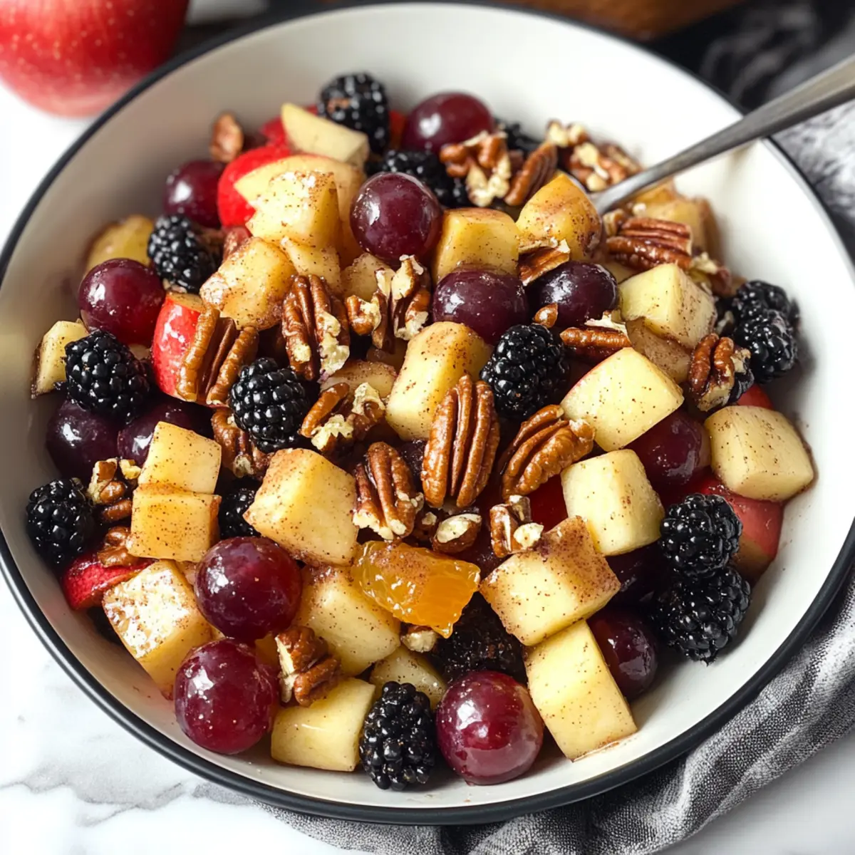 Fresh, Seasonal Ingredients: Embrace the flavors of fall with this delightful fruit salad featuring crisp apples, juicy blackberries, and sweet grapes that radiate autumn’s essence.