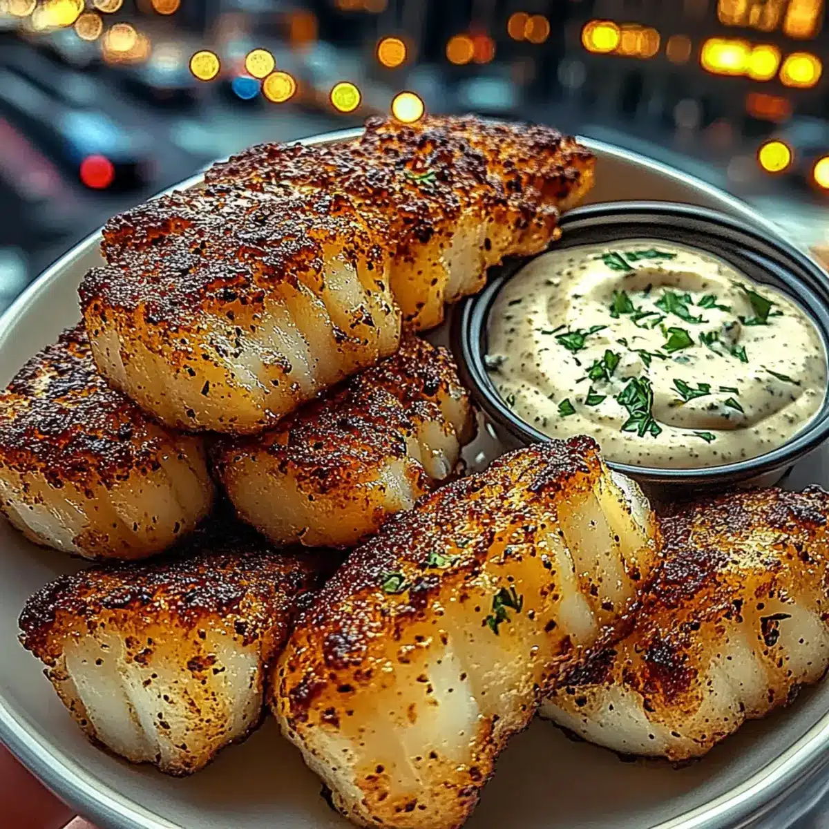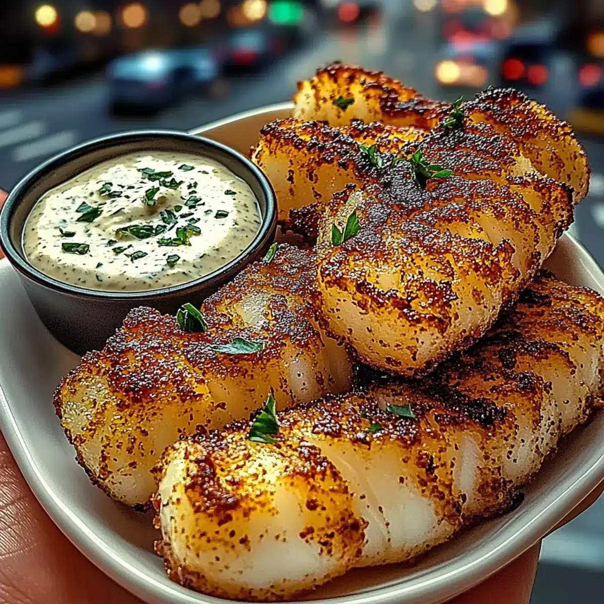 - Serve the warm cod bites alongside the creamy lemon herb dip.