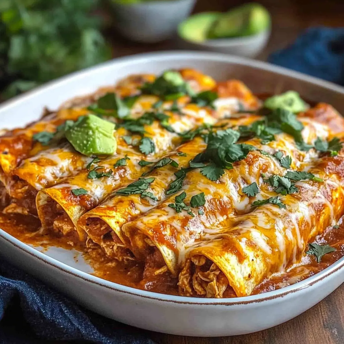 - Let the enchiladas rest for 5 minutes, then garnish with cilantro, avocado, or Greek yogurt and serve.
