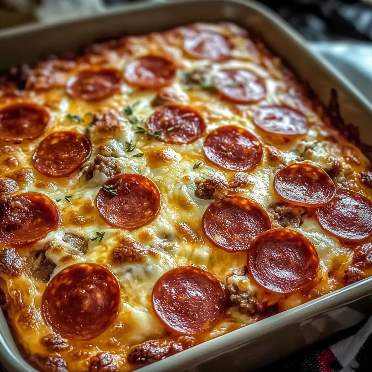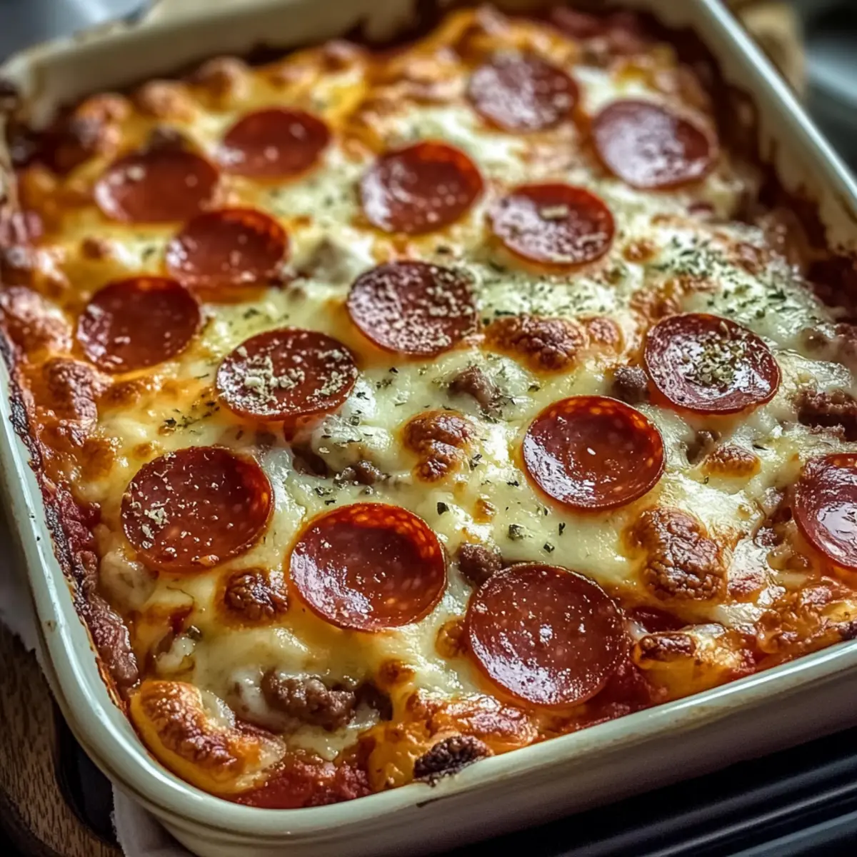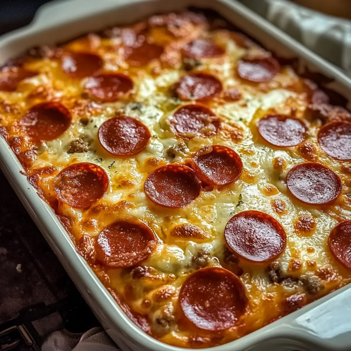 - Pour the mixture into the prepared baking dish and spread evenly. Top with remaining turkey pepperoni.