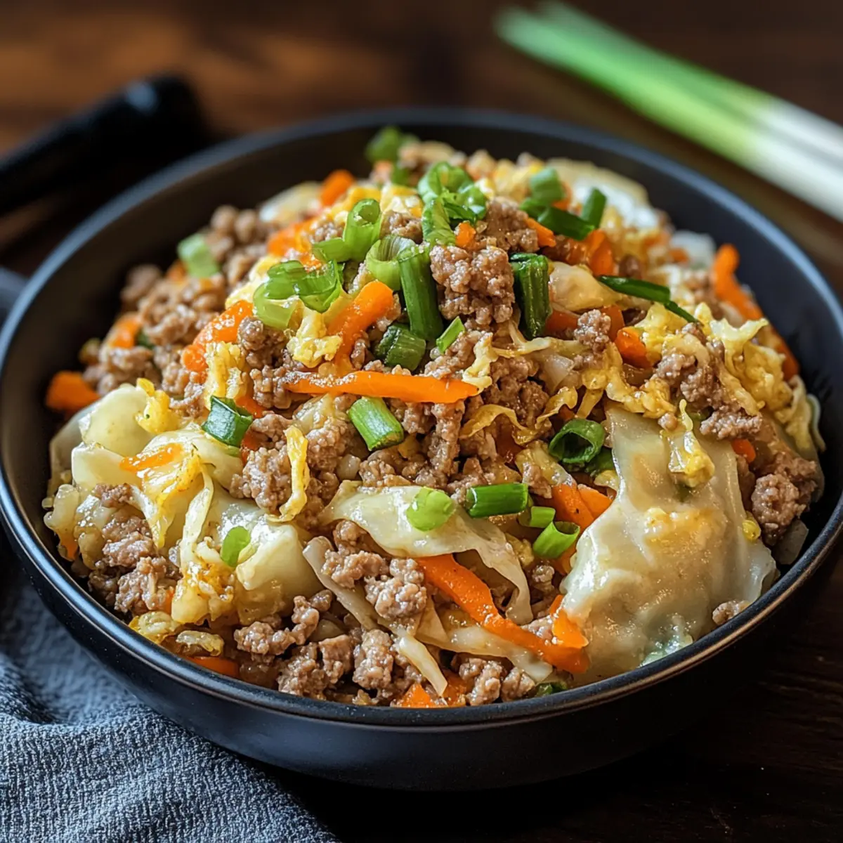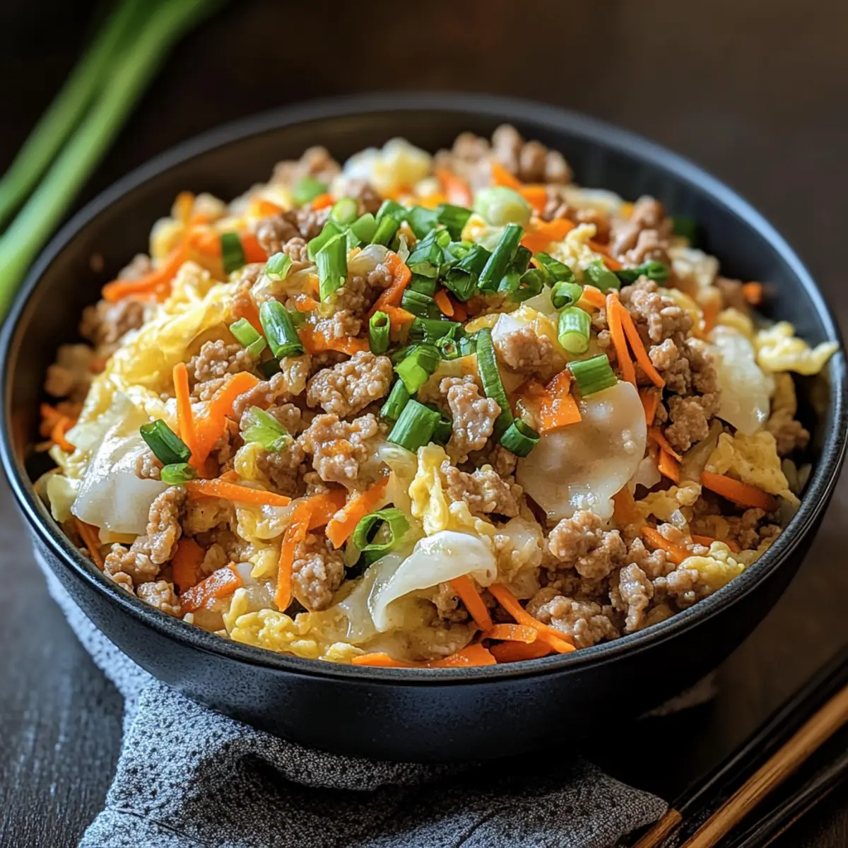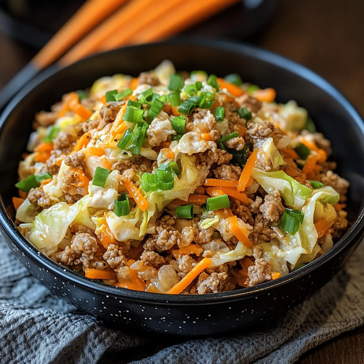 Start by preparing your ingredients for the Keto Egg Roll in a Bowl. Finely shred the green cabbage and julienne the carrots to maximize texture. Mince the garlic and ginger thoroughly to unleash their aromatic flavors. Finally, chop the green onions and set aside to add freshness at the end. Having everything prepped will make the cooking process smooth and enjoyable.