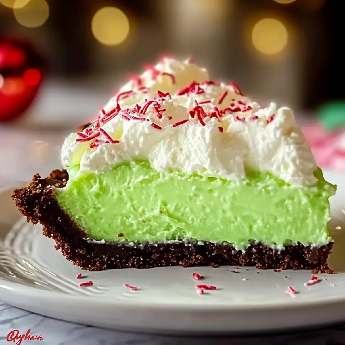For a festive touch, decorate the top of the pie with whipped cream, creating swirls or dollops as desired. Sprinkle green sprinkles evenly over the top, and, if you’d like, add crushed candy canes or red sprinkles for an extra pop of color and texture. This colorful assortment makes the pie visually appealing and adds a little holiday cheer.