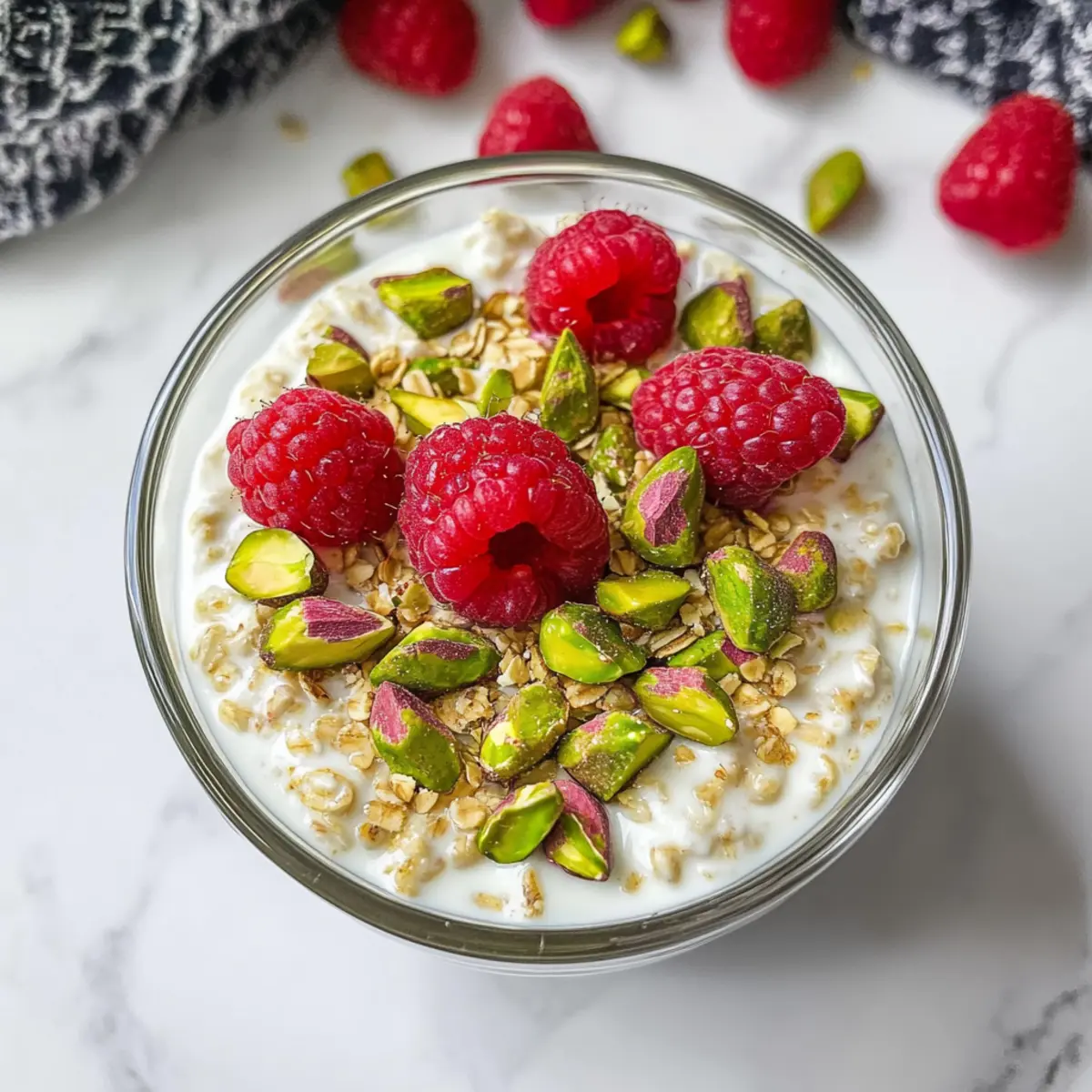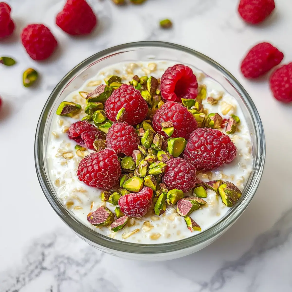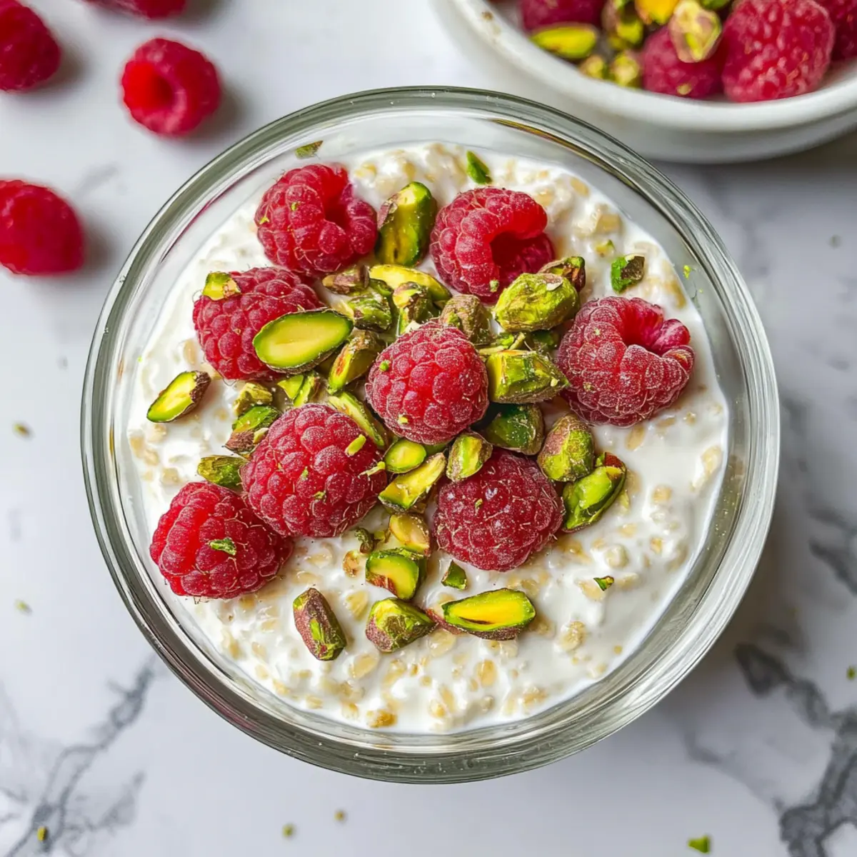 The following morning, remove the jar from the fridge and give it a good stir to rehydrate the oats fully. To serve, top your creamy Pistachio Overnight Oats with your choice of non-dairy yogurt, fresh raspberries, and a sprinkle of chopped pistachios, adding both color and texture to this delicious breakfast. Enjoy this vibrant start to your day!