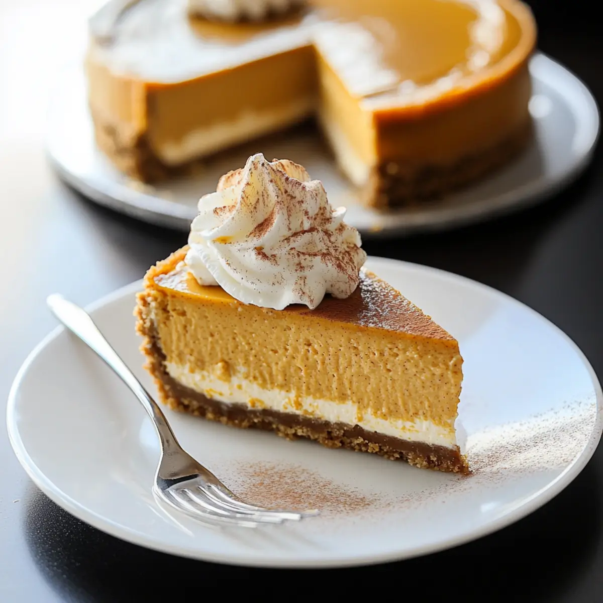 When ready to serve your Pumpkin Cheesecake, carefully remove it from the springform pan. Garnish with fresh whipped cream and a sprinkle of cinnamon for a lovely touch. The rich, creamy texture combined with the spiced flavor makes this dessert a perfect conclusion to your fall celebrations. Enjoy!