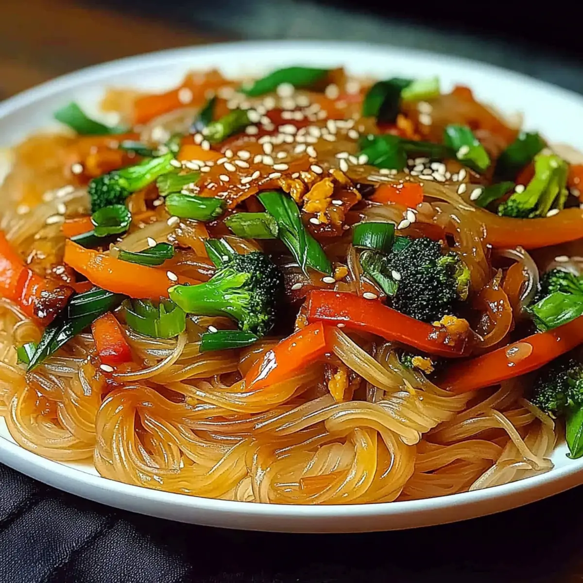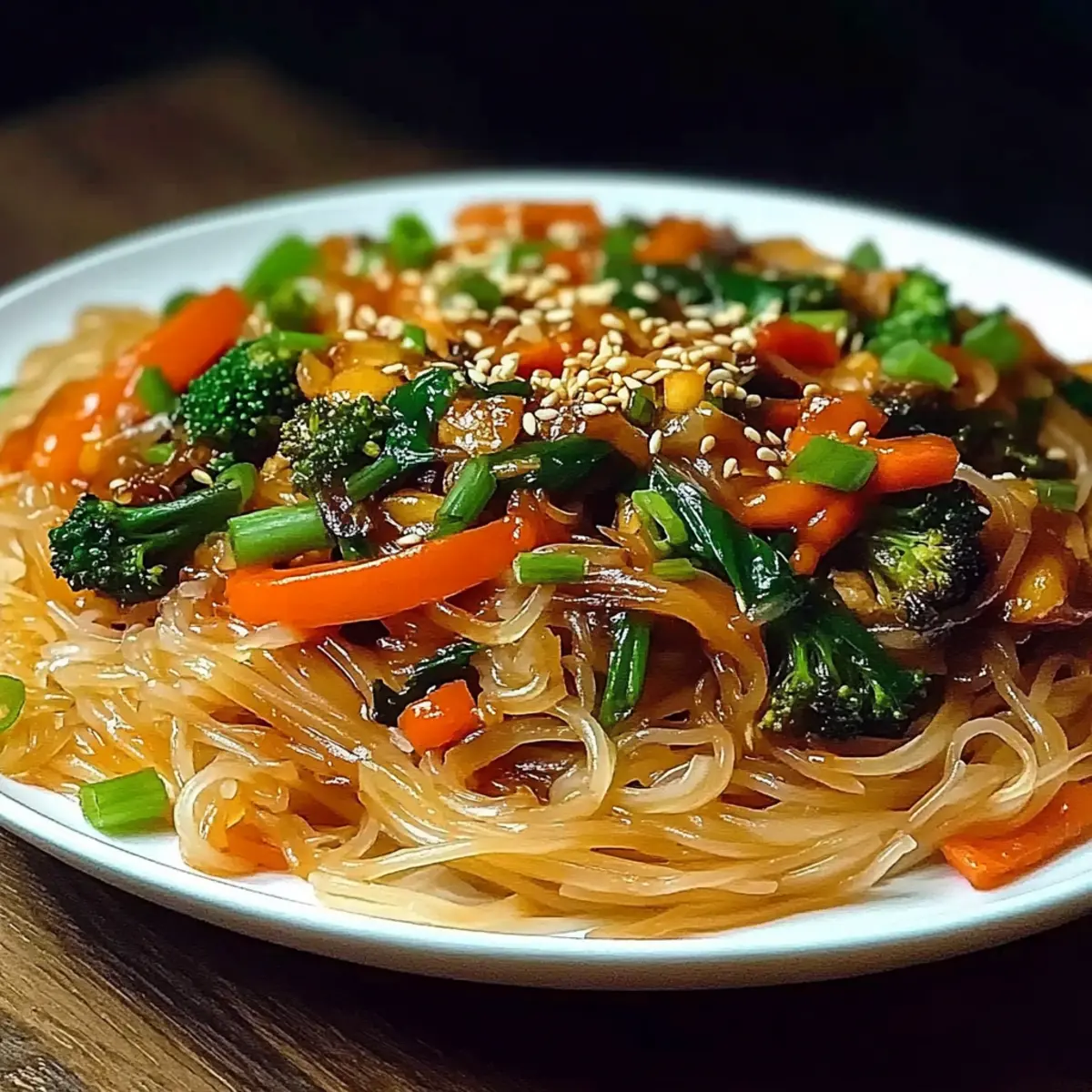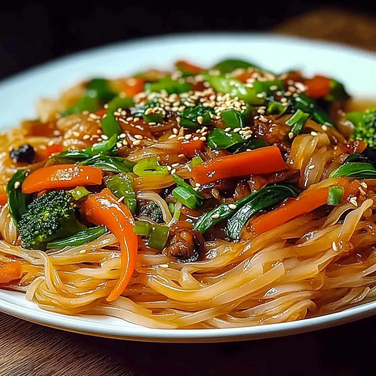 Finally, drizzle 2 tablespoons of sesame oil over the stir-fry for an extra layer of flavor. Toss everything one last time to incorporate the oil. Serve immediately, optionally garnished with sesame seeds and sliced green onions for added freshness and crunch. Enjoy your vibrant rice noodle stir-fry!