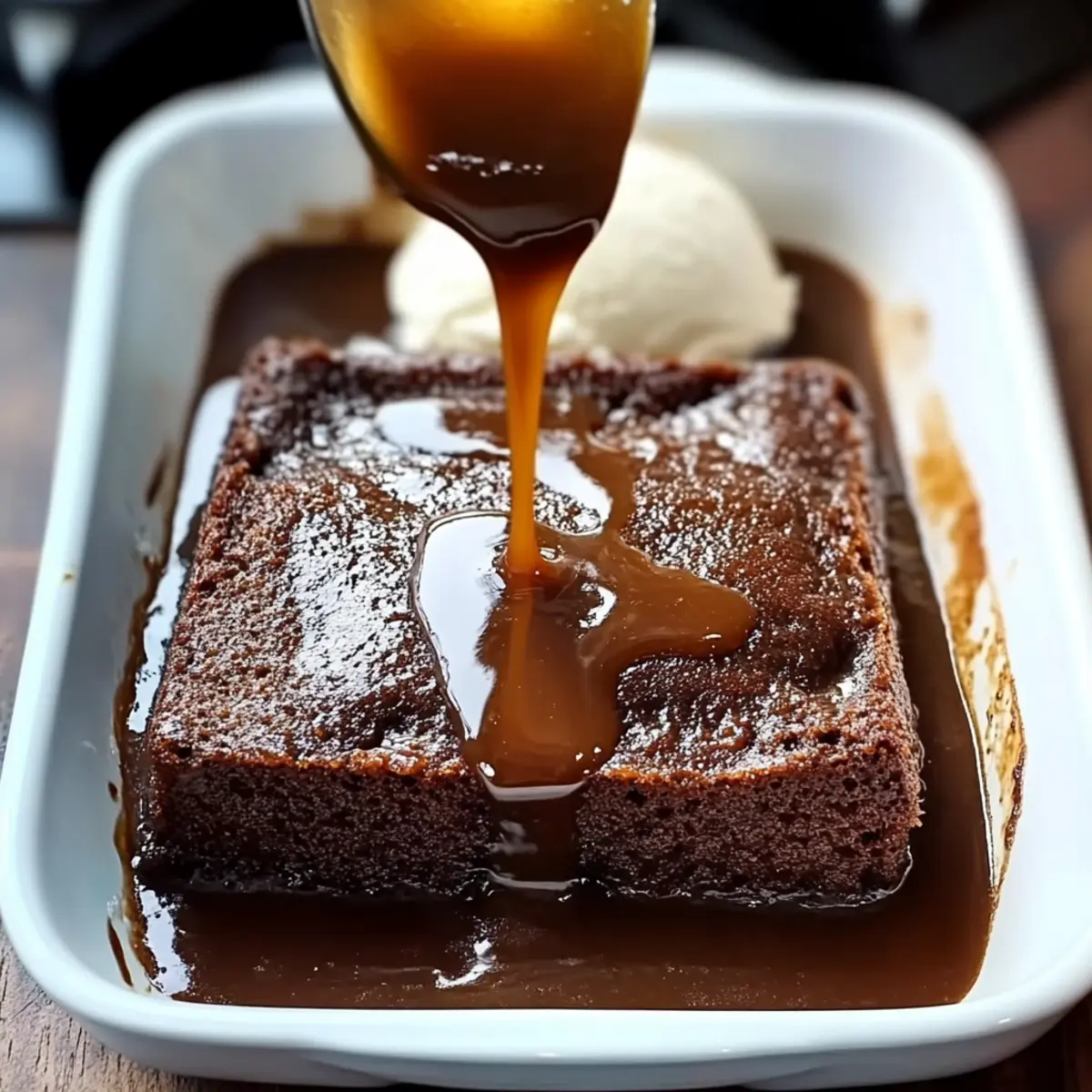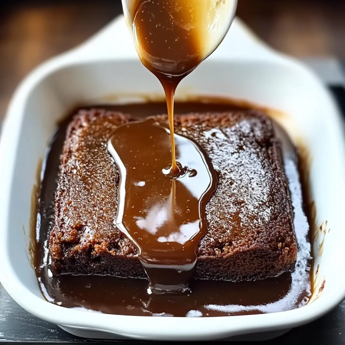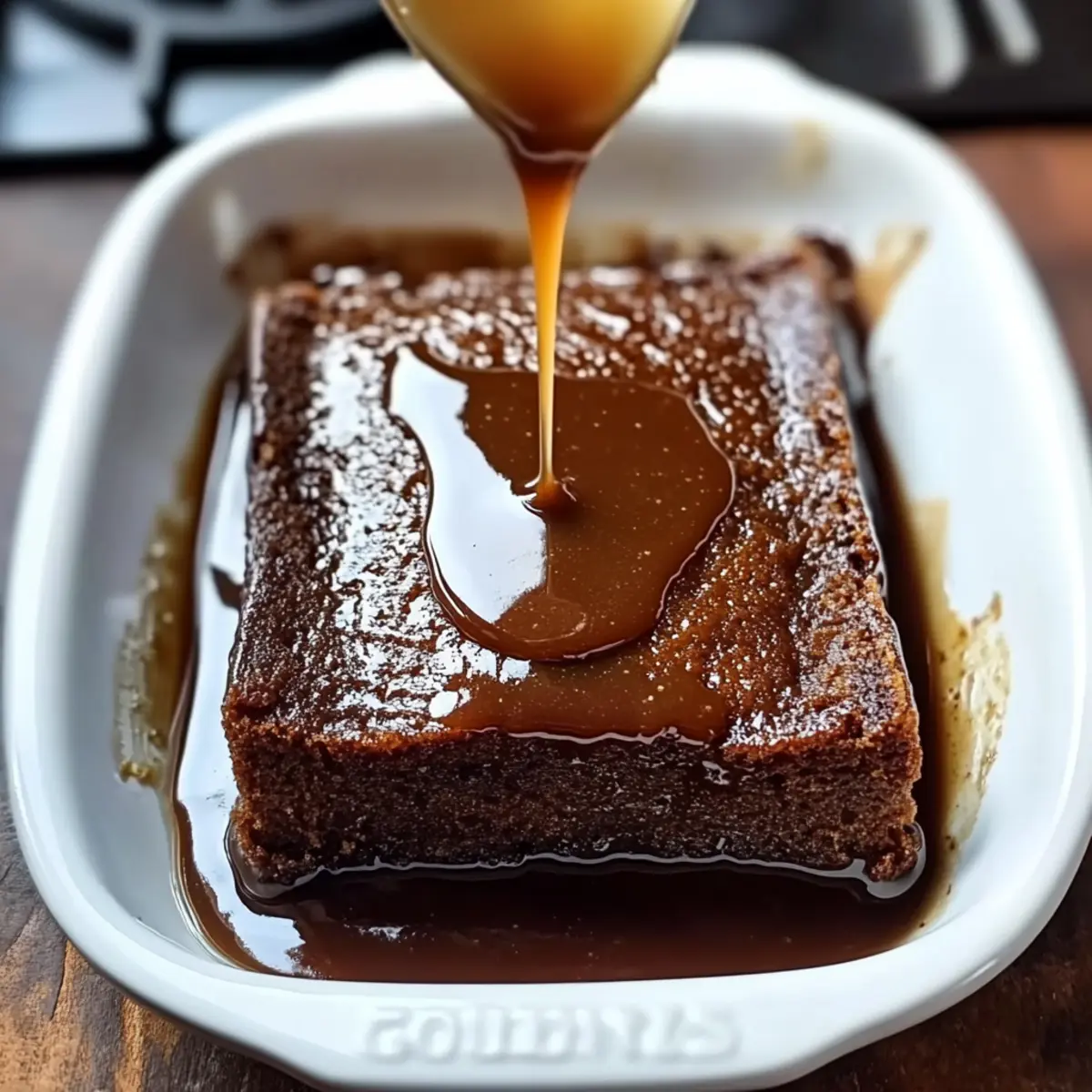 - Once the pudding is done, remove it from the oven and pour the warm toffee sauce generously over the top.