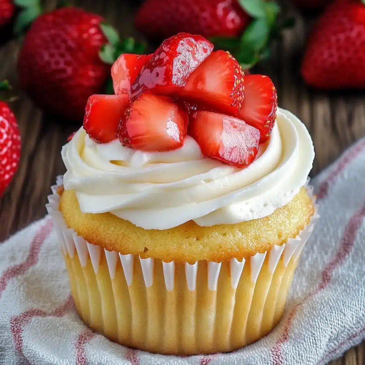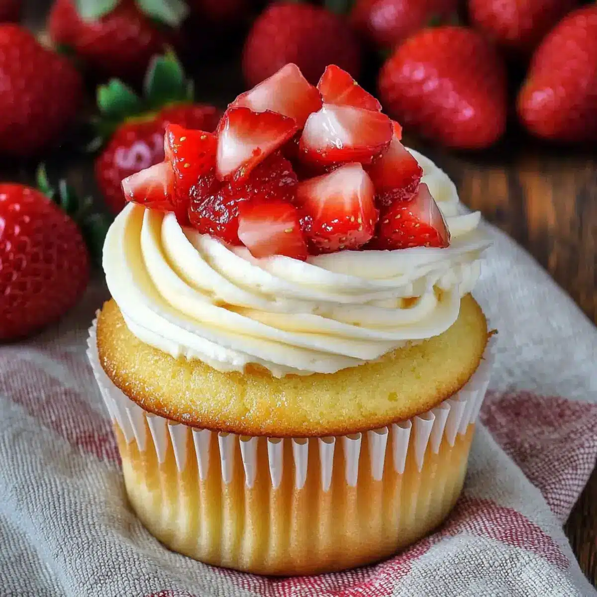Absolutely! If you’re looking for vegan options, simply substitute eggs with flax eggs (1 tbsp flaxseed meal mixed with 3 tbsp water per egg) and use a non-dairy milk for the batter. For those with gluten sensitivities, opt for a gluten-free flour blend in place of the all-purpose flour. Enjoy the flexibility of making these Strawberry Shortcake Cupcakes suitable for various dietary needs!
