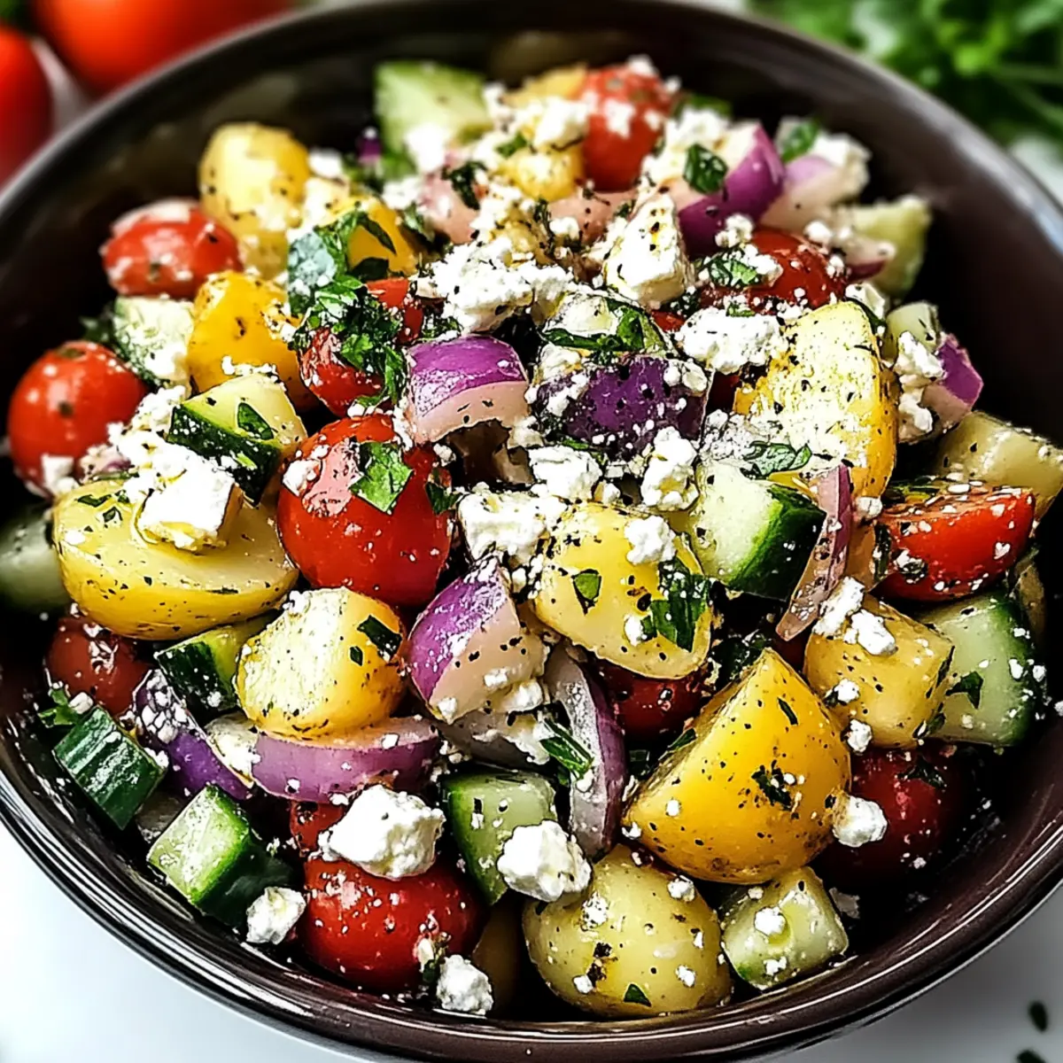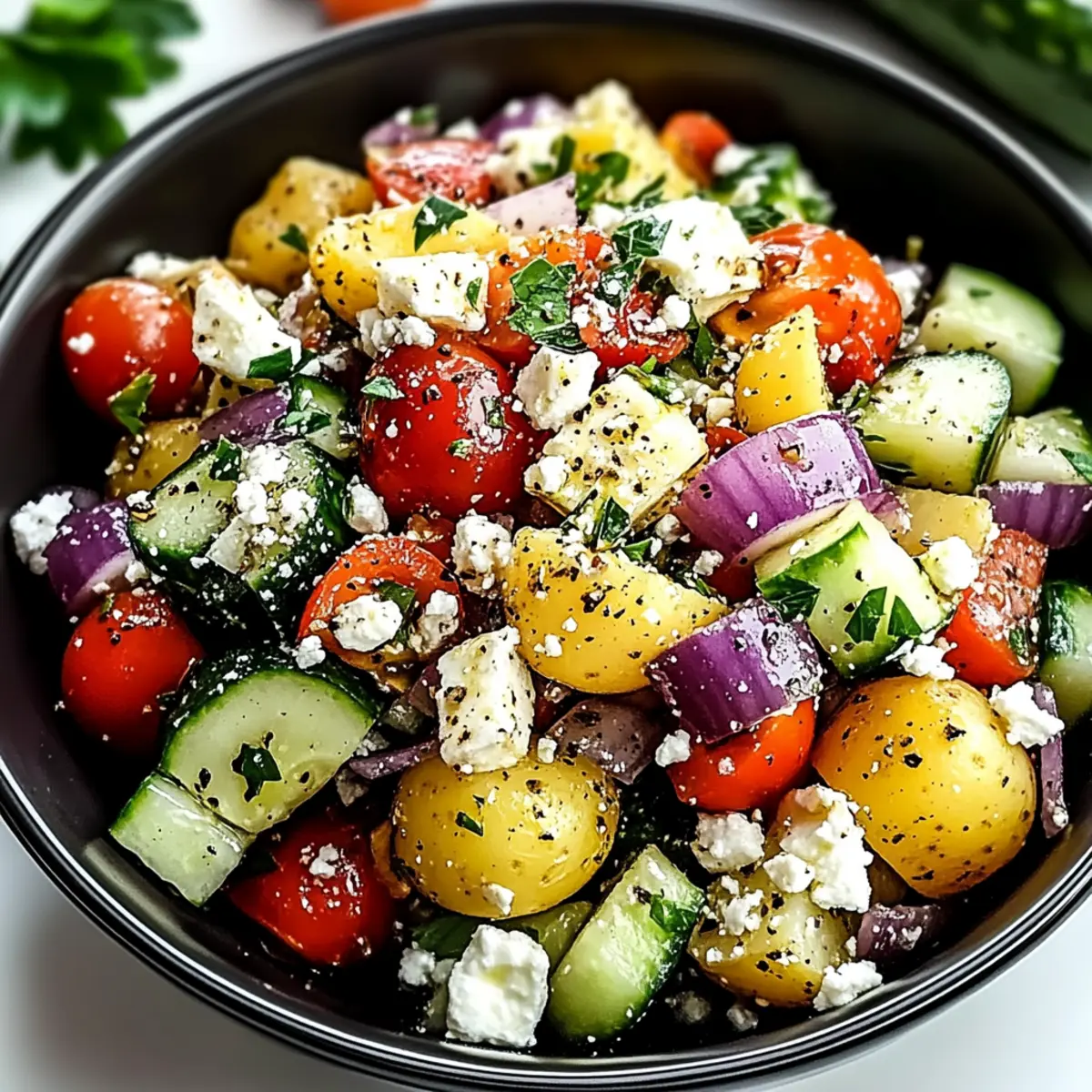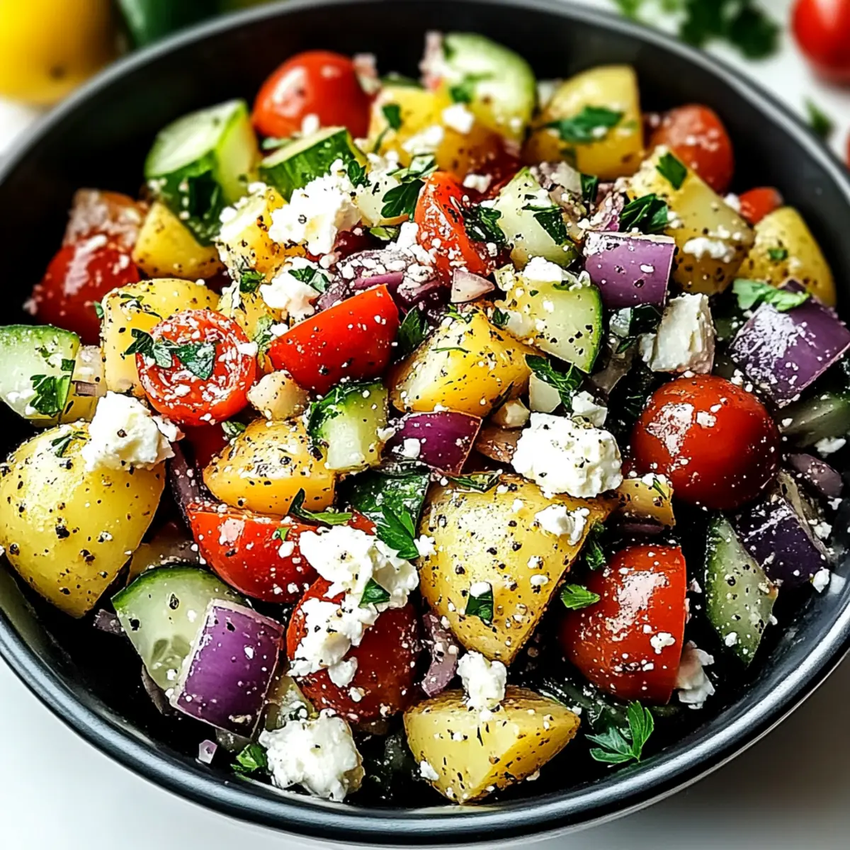 As I rummaged through my kitchen, a forgotten bag of Yukon gold potatoes caught my eye, sparking a culinary adventure. That’s when I decided to whip up a Mediterranean Turkish Potato Salad, a dish that perfectly embodies the vibrant flavors of the region. This recipe is not only a breeze to prepare, making it ideal for beginners, but it’s also a healthy delight with low calories and fresh ingredients. Imagine tender potatoes mingled with crisp vegetables, all dressed in a tangy sumac and olive oil dressing, topped with creamy feta—a dish that screams summer! Whether you’re hosting a casual gathering or simply seeking a refreshing side for your grilled chicken, this potato salad will undoubtedly impress. What unique twist will you add to make it your own?