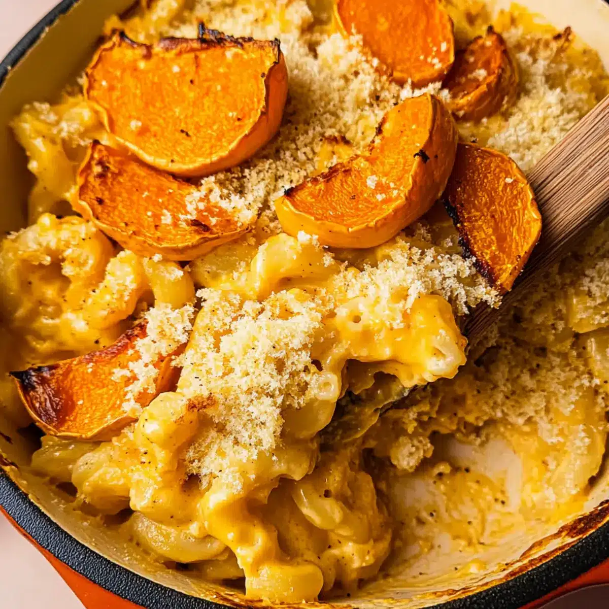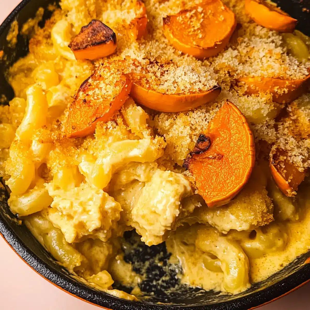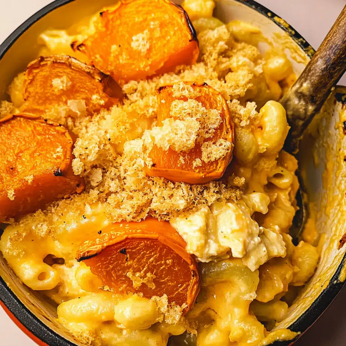 Transfer the combined mac and cheese into a casserole dish. Top generously with the roasted butternut squash slices and a sprinkle of panko breadcrumbs for added crunch. Bake in the preheated oven for 12-14 minutes, until the top is golden and crispy.