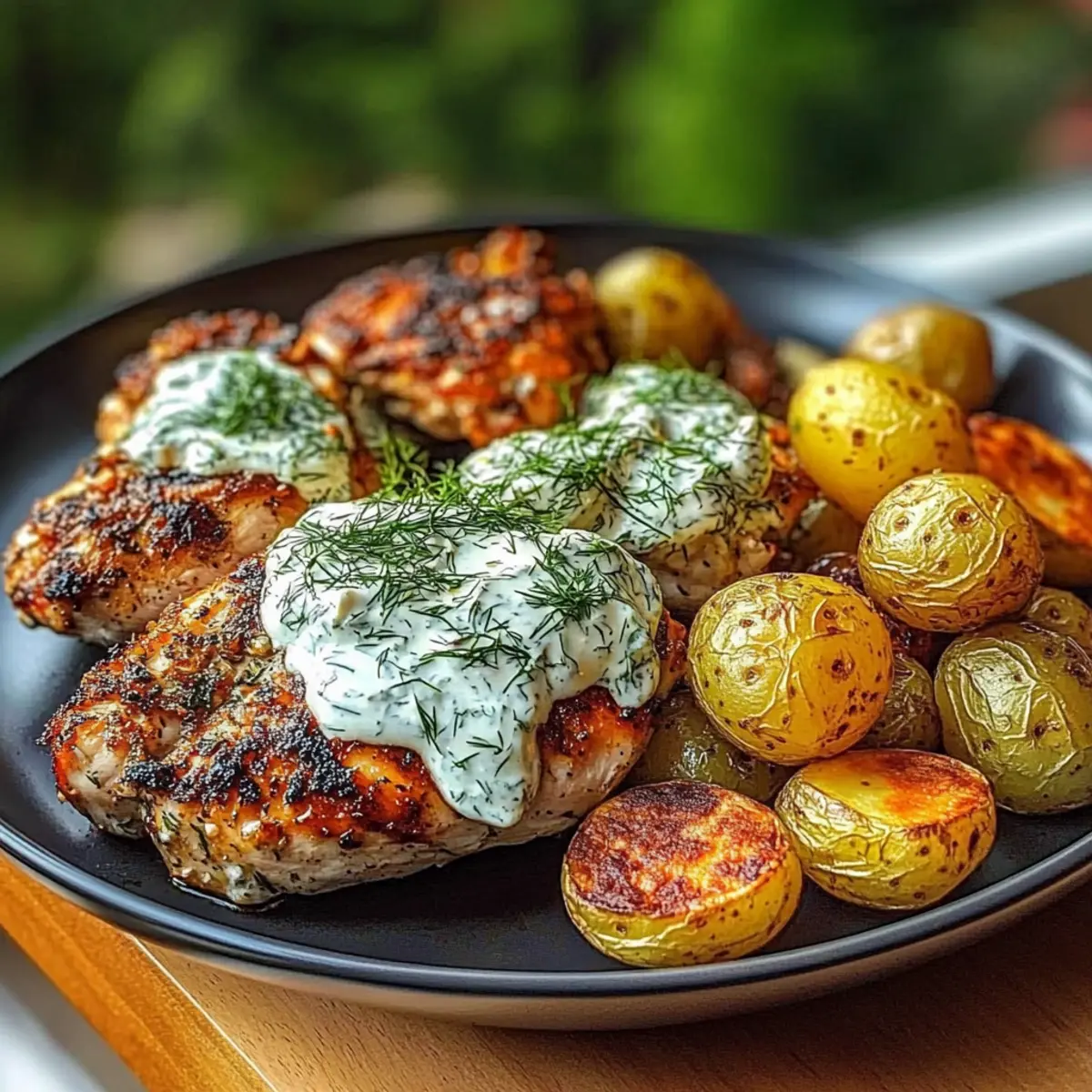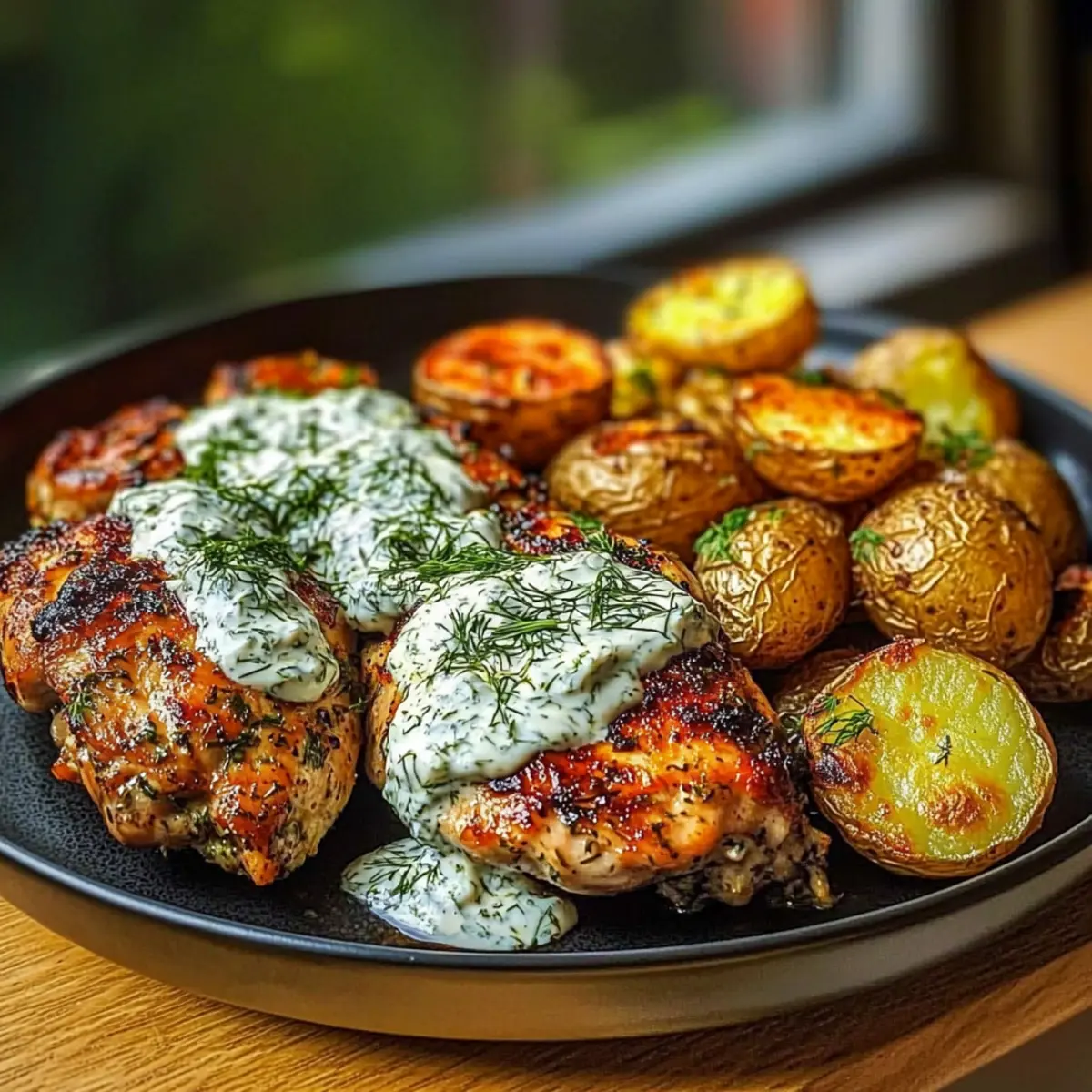 Step‑by‑Step Instructions for Spicy Yogurt Marinated Chicken with Dill Feta Cream & Crispy Baby Potatoes